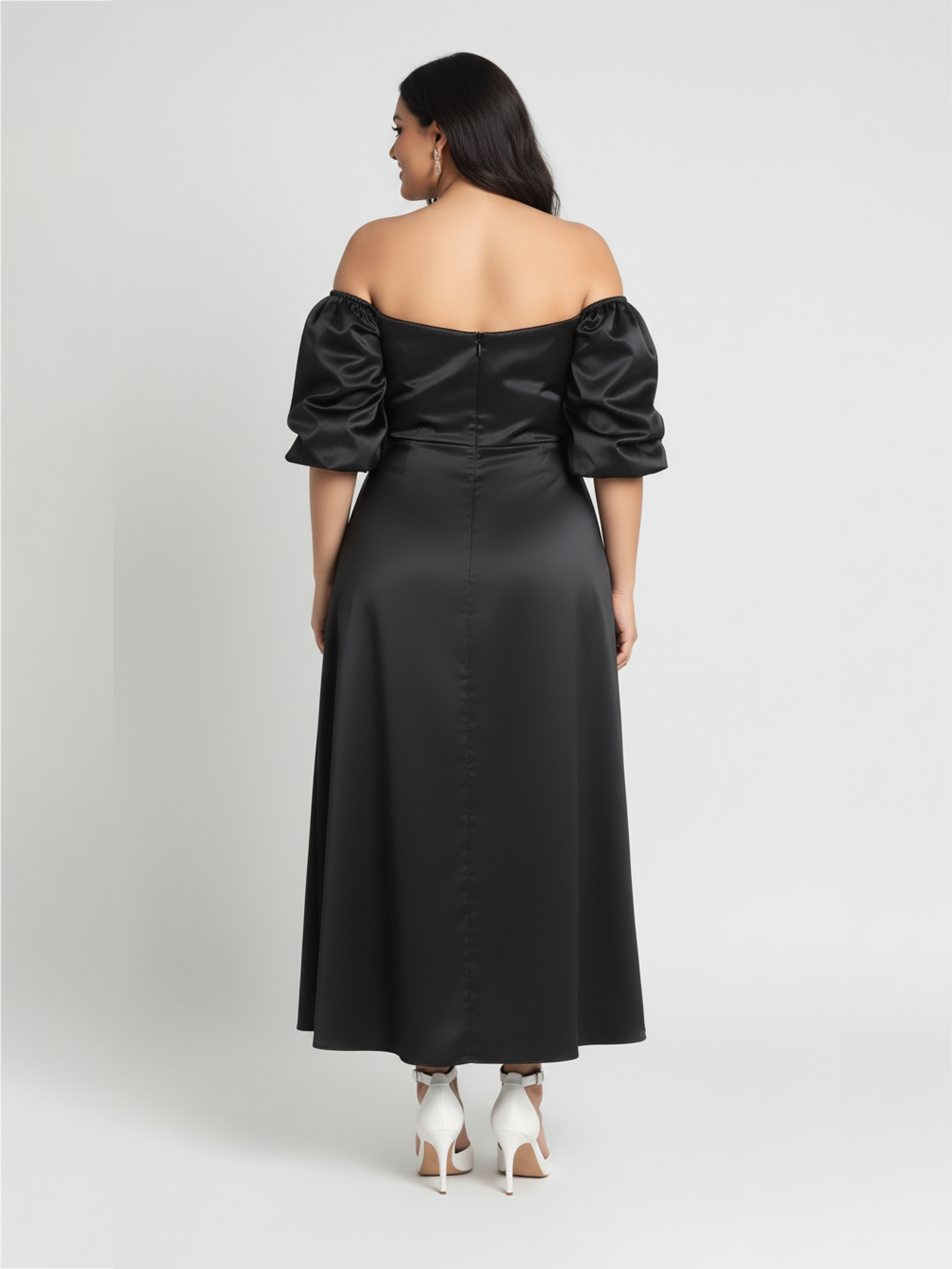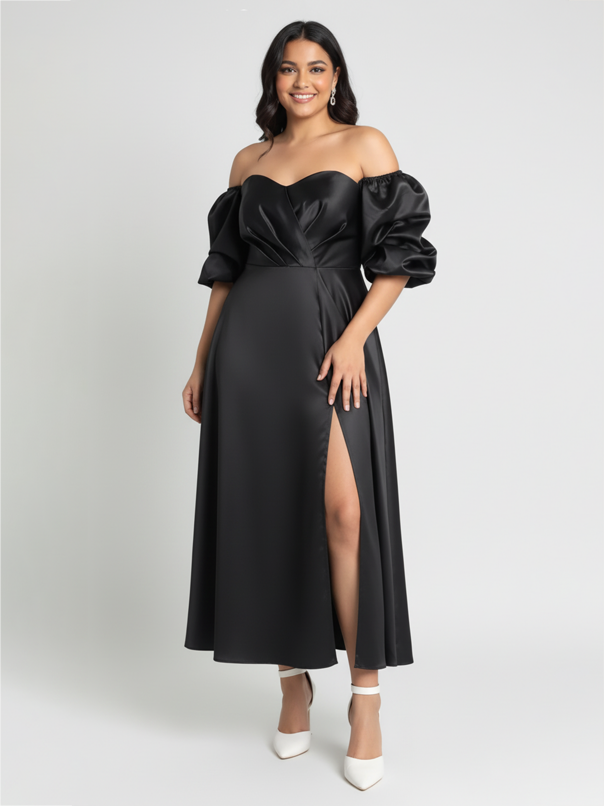 Elevate your wardrobe with the Alice Maxi Dress in a bold black color. Crafted from smooth satin, this dress features a flattering sweetheart neckline and elegant off-shoulder puff sleeves that add a touch of romance. A tasteful slit enhances movement and grace, making it perfect for refined occasions. The seamless blend of classic design and luxurious fabric ensures you stand out with timeless sophistication.