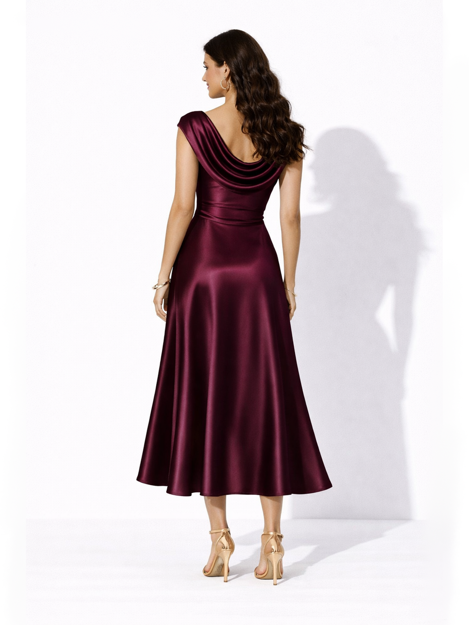 This sophisticated midi dress is the epitome of modern evening glamour. Crafted from a luxurious, high-shine satin in a deep plum or black cherry hue, it’s designed to catch the light and command the room.