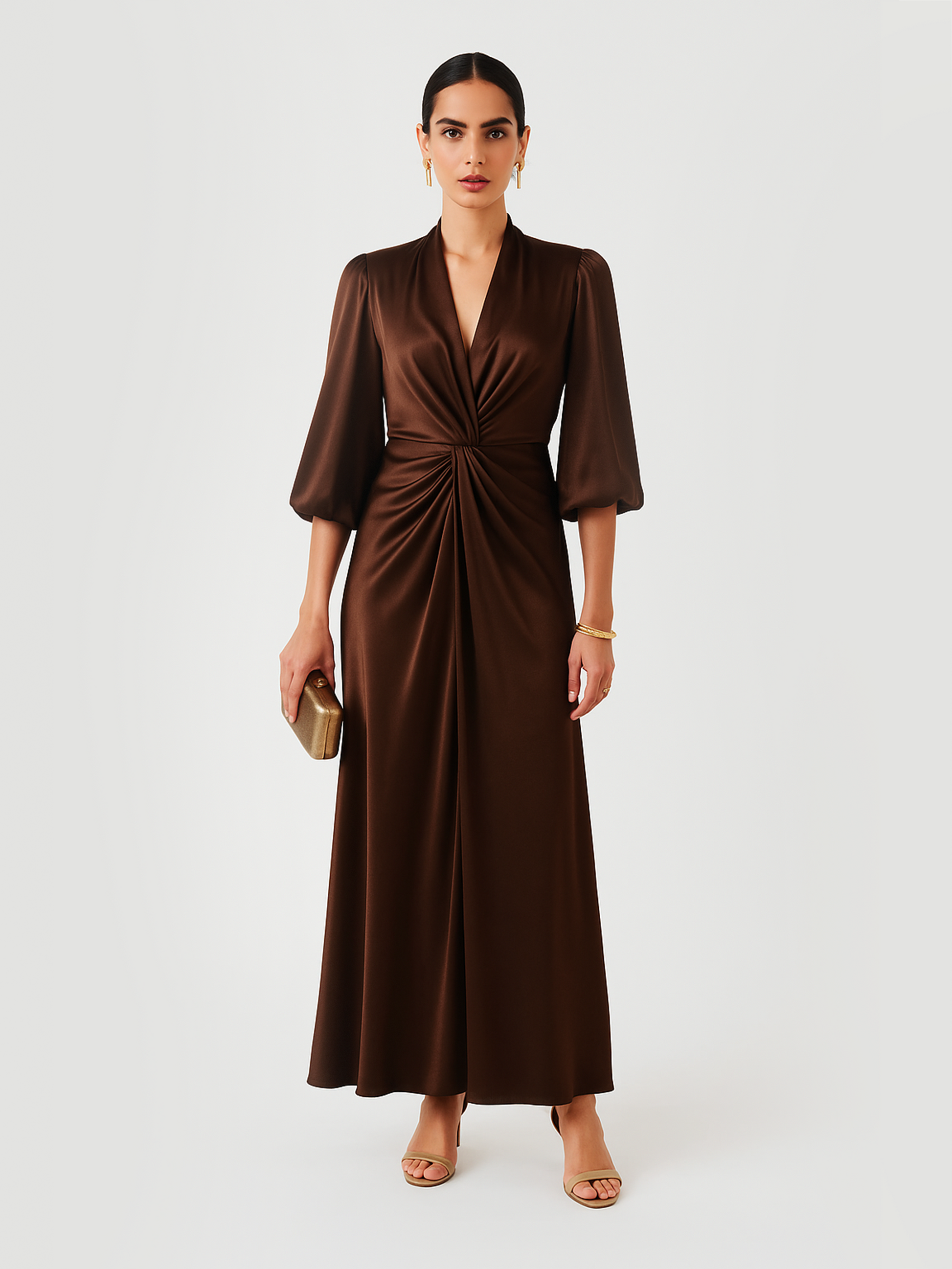 Designed in a rich cocoa-brown tone, this elegant dress features a softly draped front with a flattering twist detail that defines the waist. The deep V-neckline and relaxed sleeves add effortless sophistication, while the flowing silhouette creates a timeless, refined finish — perfect for elevated evenings and understated glamour.