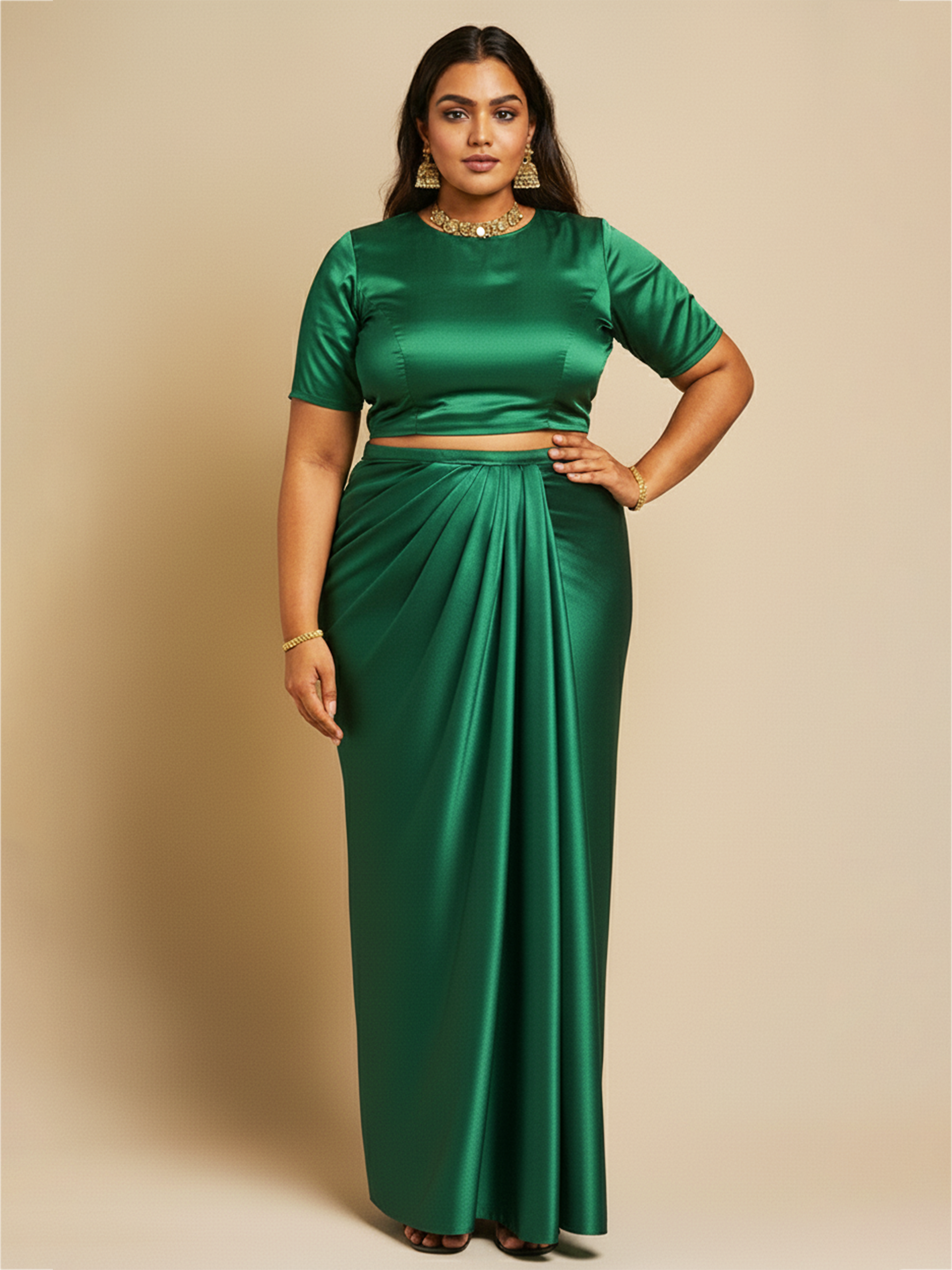 Elevate your traditional wardrobe with this sophisticated draped satin skirt. Crafted for effortless pairing with any Indianwear, it features a convenient side zip for a seamless fit. The luxurious satin drape enhances your silhouette, adding refined elegance to festive occasions and celebrations.