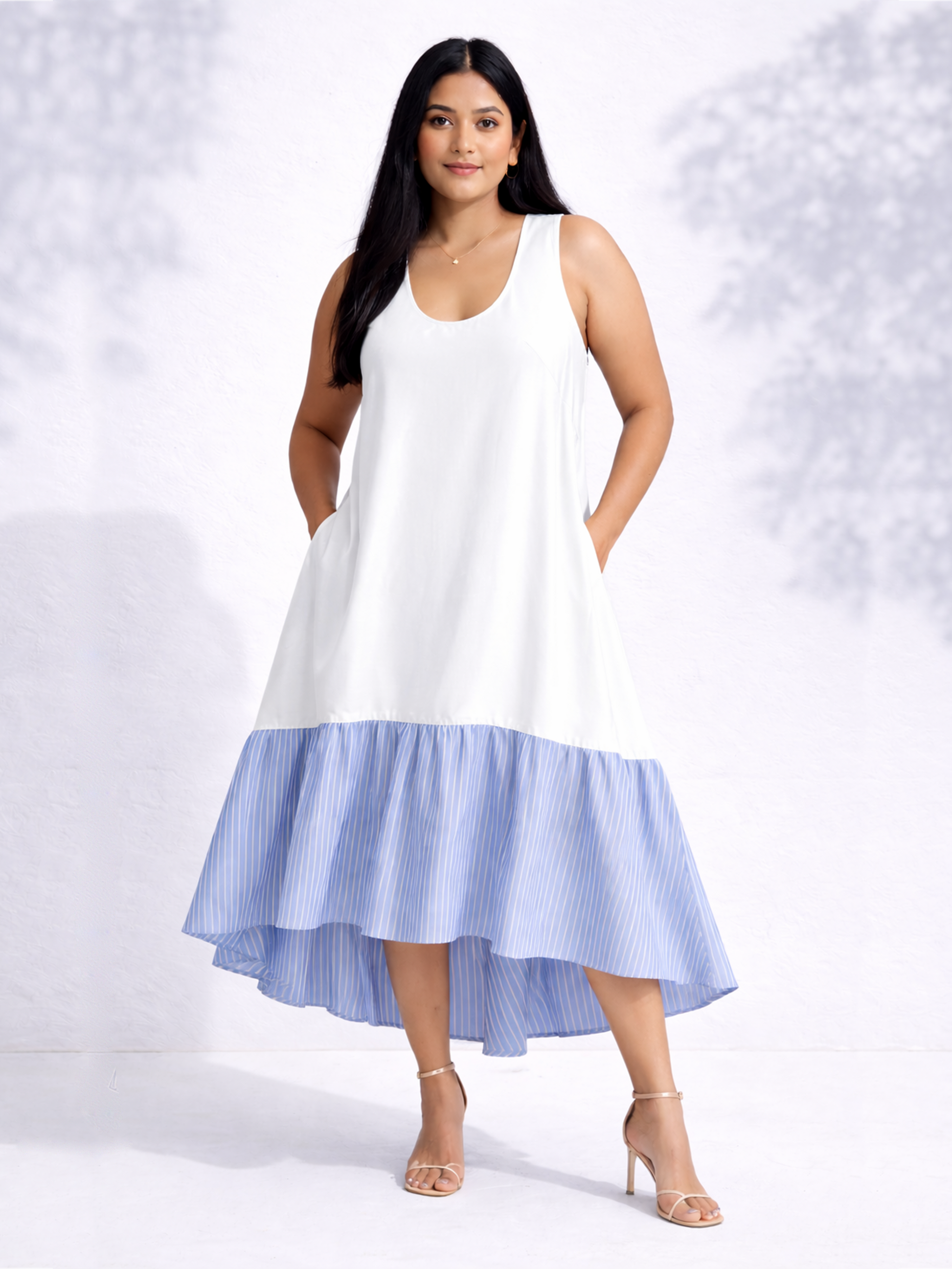 A crisp white tank-style bodice flows into a breezy, blue-striped ruffled hem. The dramatic high-low cut makes it the perfect "throw-on-and-go" piece for summer.