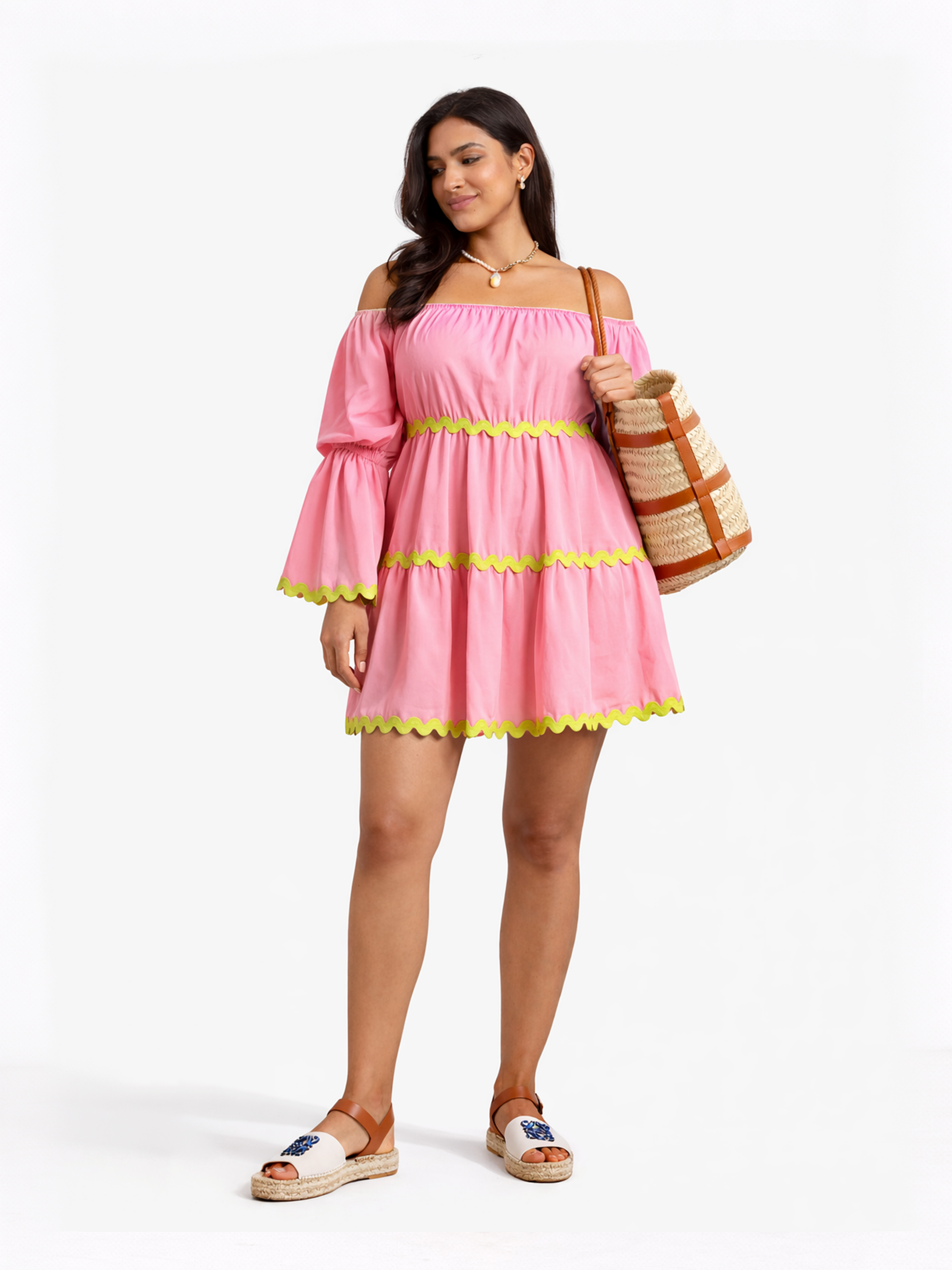 This playful and breezy mini dress is the ultimate "vacation-ready" piece, blending feminine details with a bright, high-contrast palette. Perfect for beach strolls, brunch, or a summer garden party.