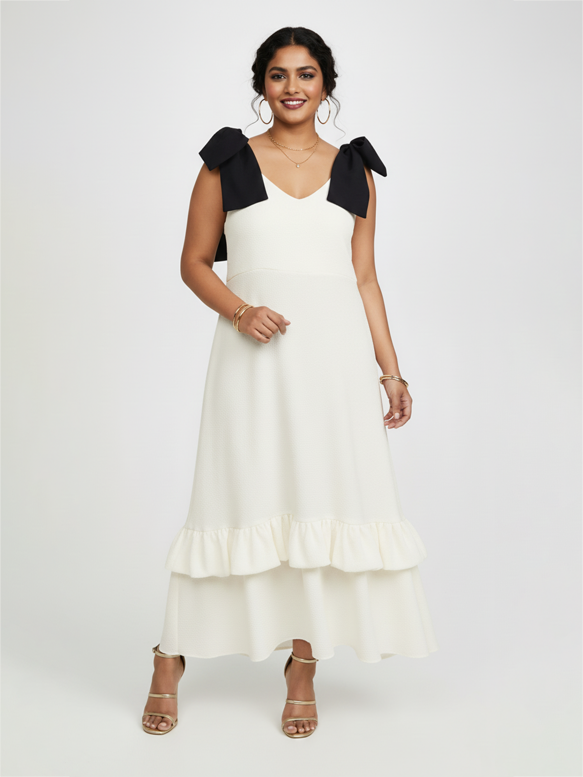 This charming ivory dress is crafted from soft white cotton and features playful tiered layers that add bounce to every step. Sweet bows adorn the sleeves, bringing a whimsical touch to its airy design. Perfect for carefree days when comfort meets cute style.